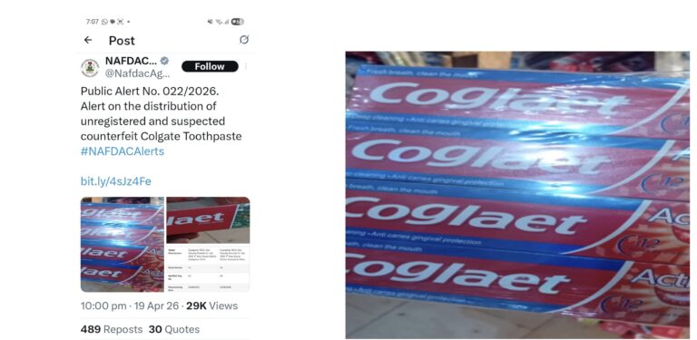 The National Agency for Food and Drug Administration and Control has raised the alarm over the distribution of unregistered and counterfeit Colgate toothpaste, warning that the products pose a potential risk to public health and safety.